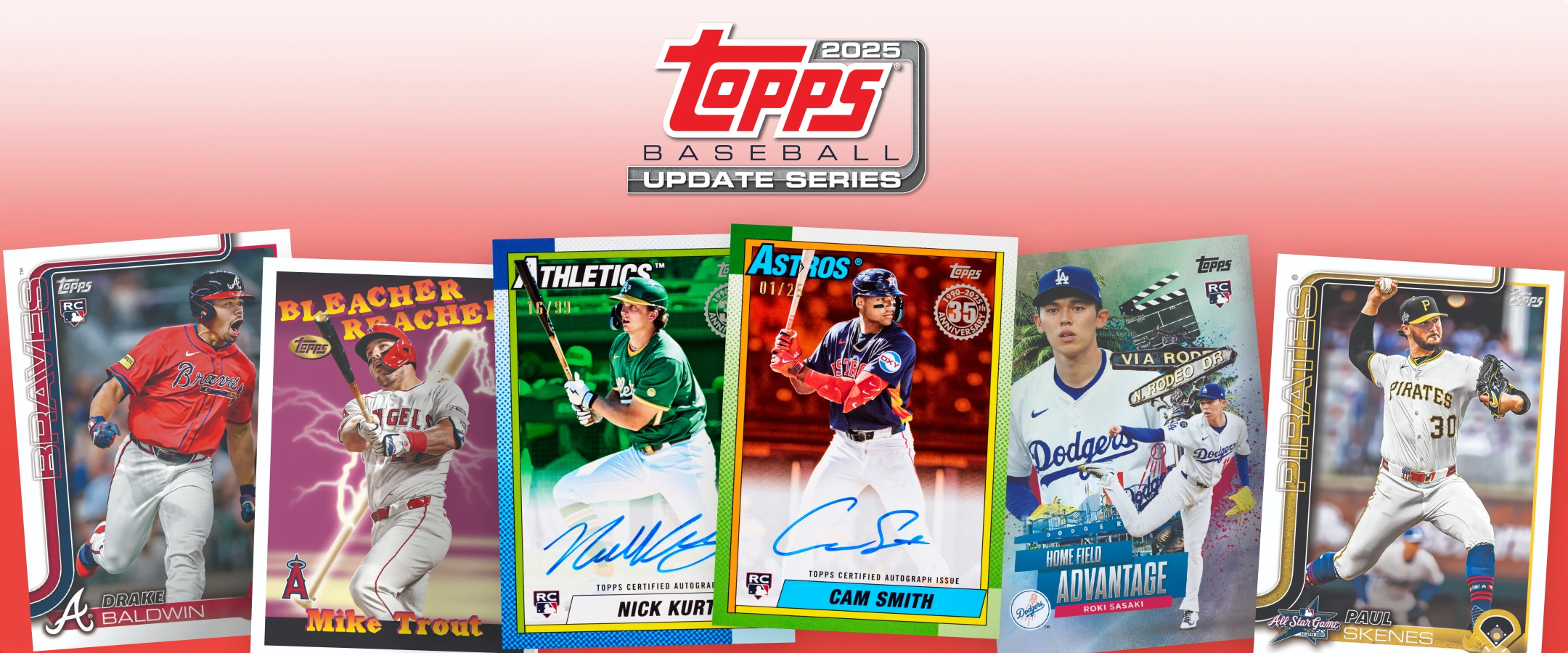2025 Topps Baseball Update Series delivers a Hobby-favorite mix of MLB® rookies, stars, and legends, all showcased in the iconic 2025 Topps Flagship design. The 350-card base set includes Rookies, Rookie Debut, traded players and more, with a sprawling lineup of parallels spanning Hobby, Retail, and SKU exclusives. Collectors will find fan-favorite Gold, 1-of-1 Foilfractors, and all-new Value Box Holiday variations.